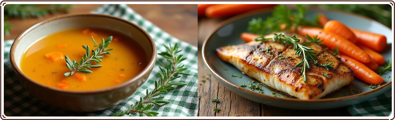 Thyme is known for its strong, earthy flavor with subtle minty and lemon undertones. It thrives in a variety of culinary contexts, from Mediterranean to French cuisine, imparting a distinctive aromatic essence that enhances meats, soups, and sauces.